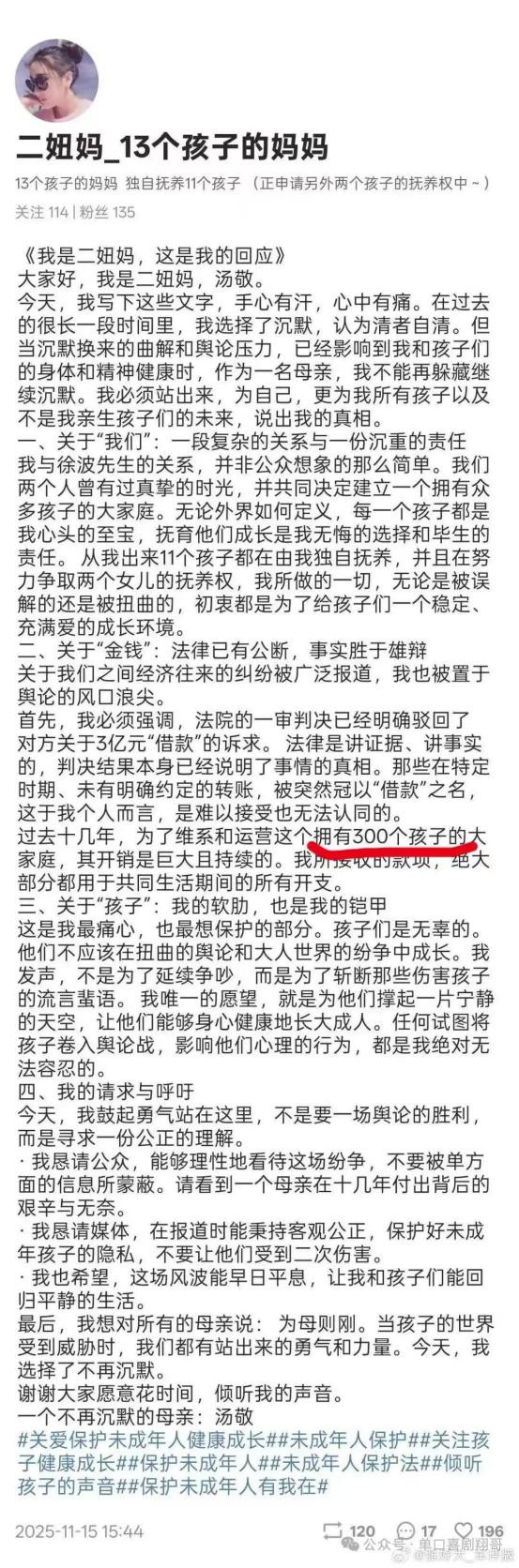 这场纠纷也让徐波“多生子女”的计划更多细节曝光。