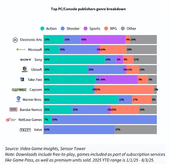 例如,EA在体育类游戏领域的优势尤为突出,下载量占其总下载量的40%,同时还依赖于《EA FC》《UFC》和《Madden》的持续成功。