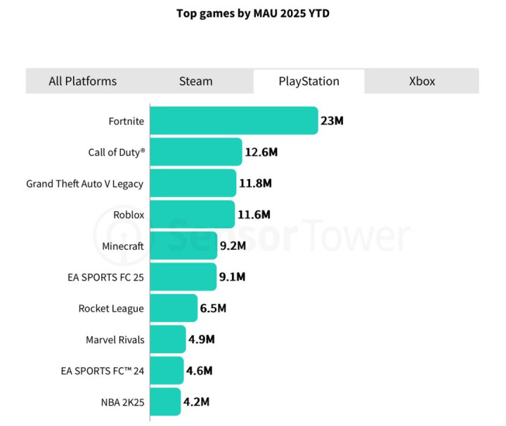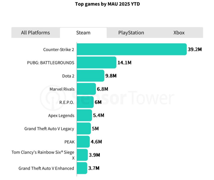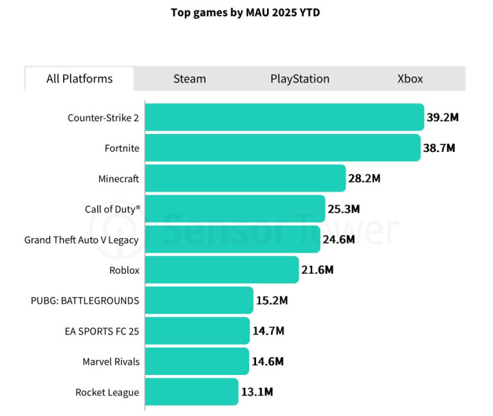 2025年,《反恐精英2》以全平台最高MAU成为最热门游戏,且所有玩家均通过Steam平台游玩。排名第二的是只统计主机平台数据的《堡垒之夜》。