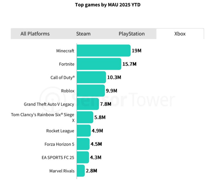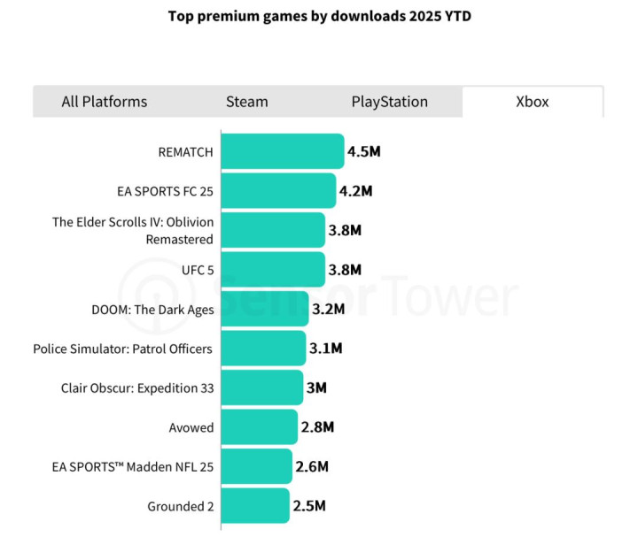 Xbox的热门游戏大多数都是Xbox Game Pass收录的作品。有趣的是,仅从下载量来看,《REMATCH》的表现已超过《EA SPORTS FC 25》。