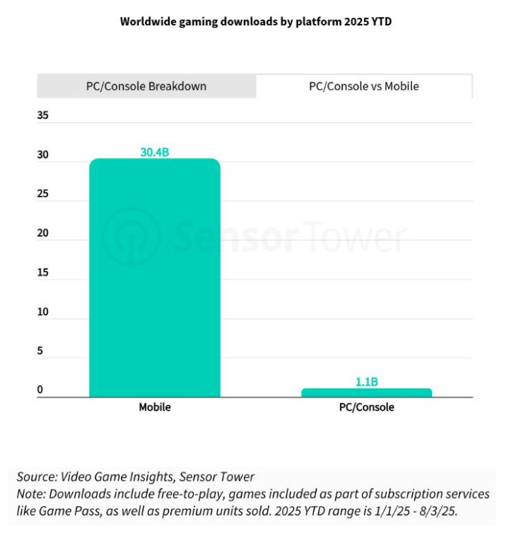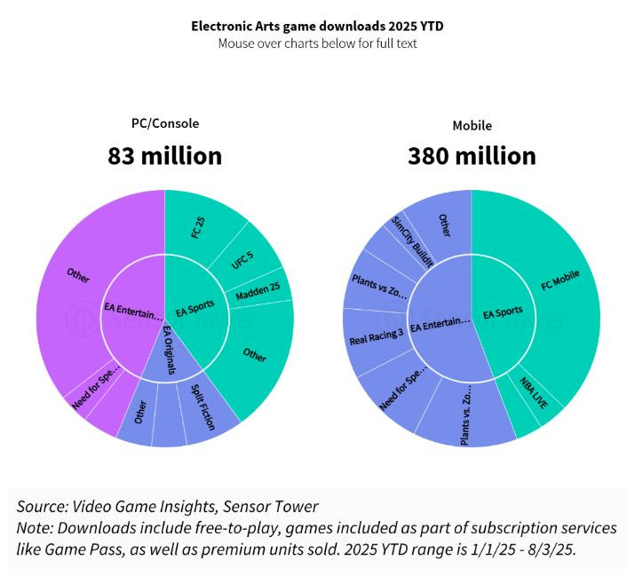 尽管两类平台的下载量不具备直接可比性(移动平台下载量以免费游玩游戏为主),但这一数据仍凸显了EA在移动领域的强大影响力。