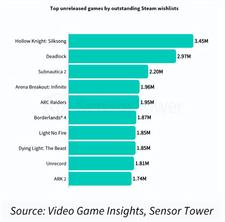 值得一提的是,在报告撰写时,《空洞骑士:丝之歌》还未正式发售。因此在Steam未发行游戏愿望单数量榜单中,它是最受期待的游戏,愿望单数量高达345万。