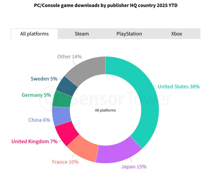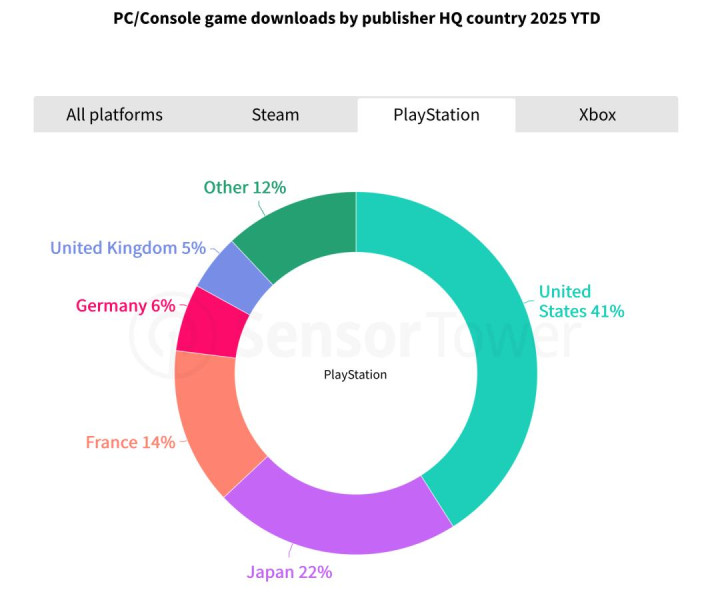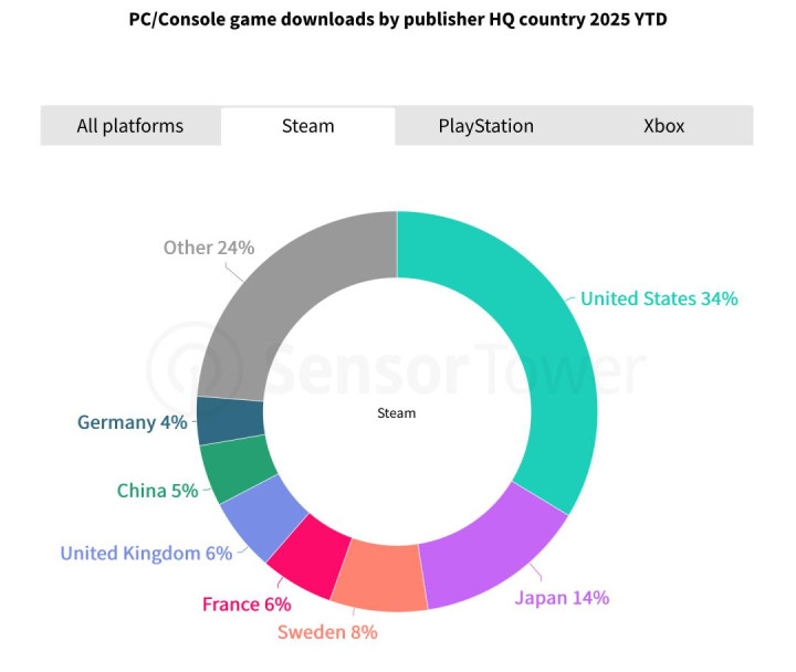 相比之下,日本发行商在PlayStation平台的下载量占比达22%,凸显了索尼自身工作室以及与日本大型发行商的合作关系。Steam平台的发行商分布相对多元化,美国和日本发行商的合计占比为48%。