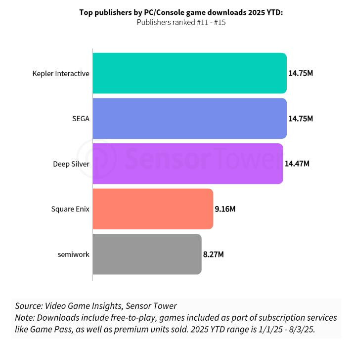 TOP5之外,卡普空、华纳兄弟、万代南梦宫和网易的下载量均超过了2400万次。开普勒互动(Kepler Interactive)凭借《REMATCH》和《光与影:33号远征队》的出色表现,跻身榜单第11位。