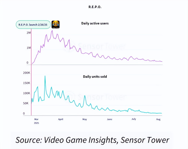 和3A游戏不同的是,《R.E.P.O.》的上线表现呈现“渐进式增长”——上线后前三周日均活跃用户(DAU)逐步攀升至200万以上,然后缓慢下降。