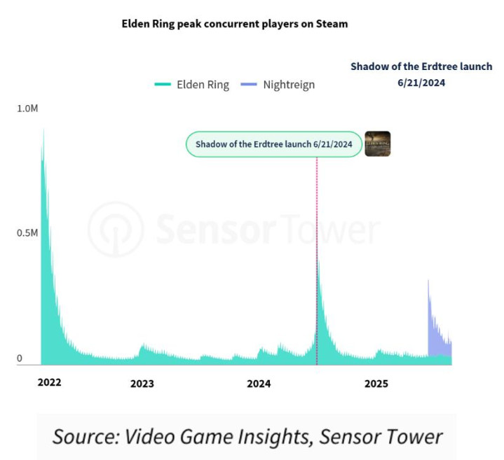 《艾尔登法环:黄金树幽影》成功激活了《艾尔登法环》的原有玩家群体,其同时在线玩家峰值达到了原作上线时的一半以上。