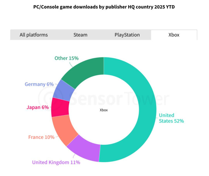 美国发行商在Xbox平台的优势尤为明显,下载量占比超50%,反映了Xbox“以美国市场为核心”的传统战略。