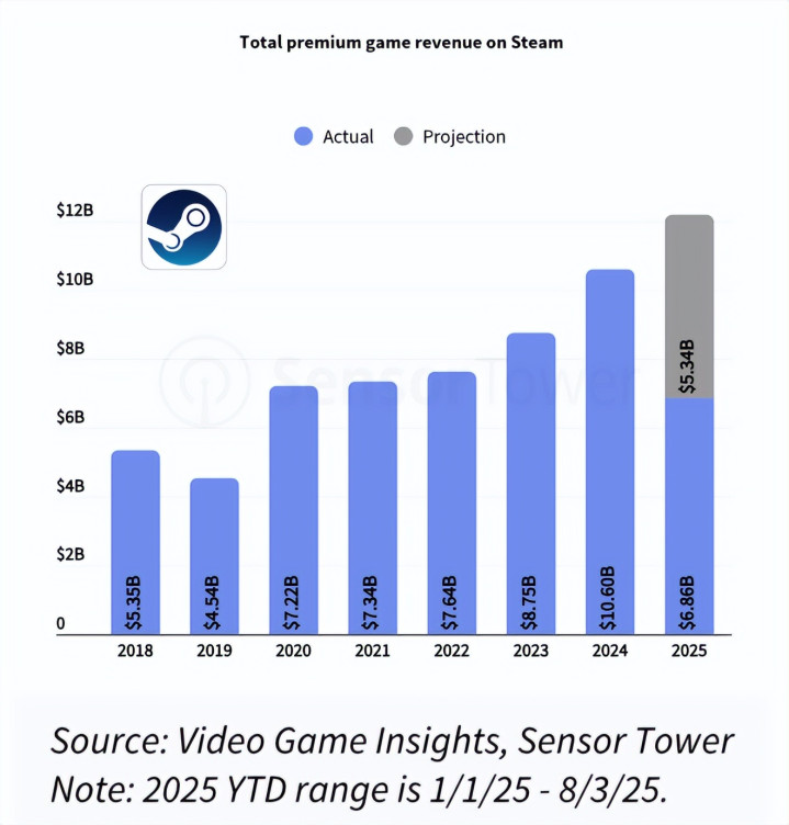 2025年年初至今(8月3日),Steam在同一营收指标上相较于2024年同期增长了15%。按照这个速度来看,今年Steam的游戏营收将会突破120亿美元(超过人民币850亿)。