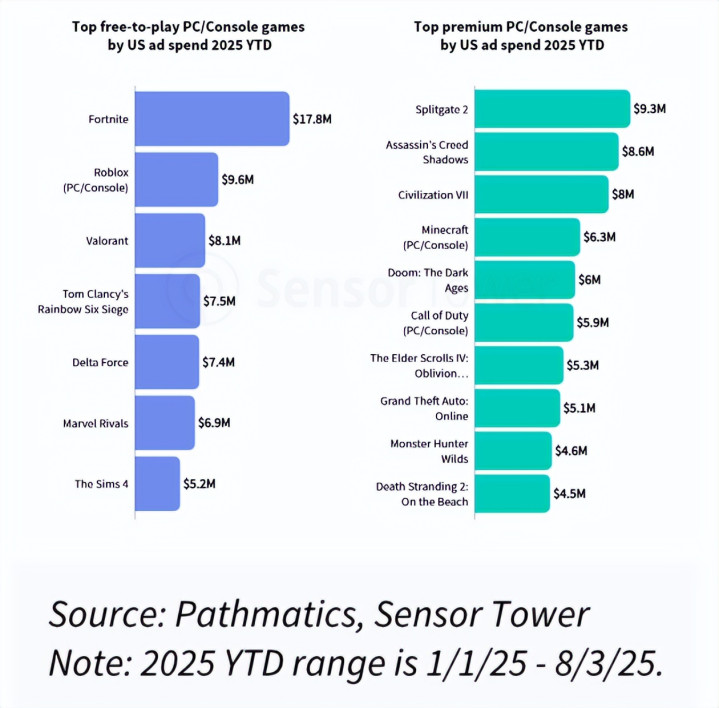 广告支出最高的三款付费游戏均为2025年新发行作品,分别为《Splitgate 2》《刺客信条:影》和《文明7》。