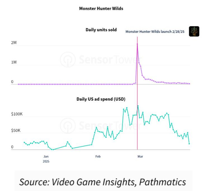 在非体育类3A游戏中,《怪物猎人:荒野》是今年销量最高的作品。与许多备受期待的3A游戏一样,该游戏的销量高度集中在上线初期——上线首日日均销量超200万份,一个月后日均销量降至约3万份。游戏的广告支出在上线大约三周后开始缩减,当时的日均销量约为6万份。