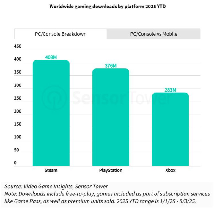 据SensorTower数据显示,从今年初到8月3日,Steam平台累计获得了4.09亿的下载量,领先于PlayStation和Xbox平台。