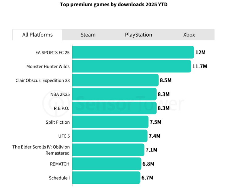 虽然《EA SPORTS FC 25》登顶销量榜榜首,但2025年同样是中体量(AA)和独立游戏的爆发之年,例如《光与影:33号远征队》和《R.E.P.O.》。