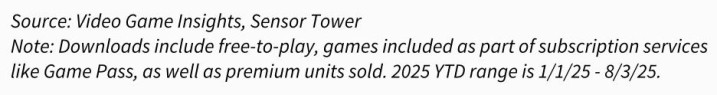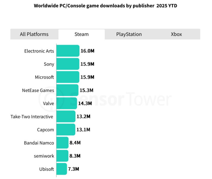 截至8月3日,EA是PC/主机游戏下载量最高的发行商,旗下游戏产品组合下载量达到8280万次;微软紧随其后,凭借强大的Xbox生态系统和Game Pass,下载量为7140万次;索尼则凭借旗下多元化工作室生态的内容支持,以5540万次下载量排名第三。