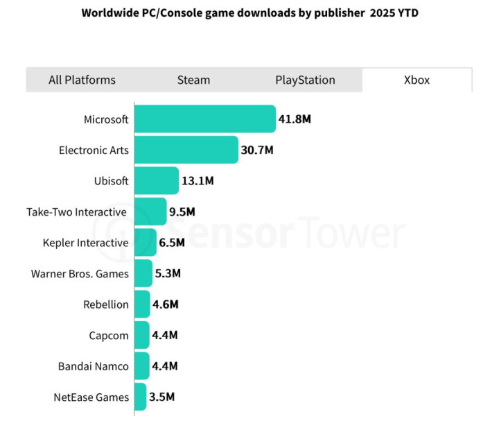 虽然排名第二,但PlayStation平台的表现依旧强劲,下载量达到了3.76亿。这体现了其作为主机领域领导者的地位,以及强大的国际市场渗透率;而Xbox尽管总下载量落后,但凭借Game Pass和跨平台兼容性,仍保持着可观的市场份额。
