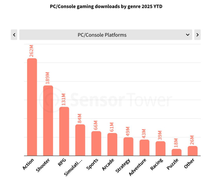 射击类游戏紧随其后,《漫威争锋》等产品的下载量达到1.89亿次;角色扮演类游戏势头同样强劲,在《怪物猎人:荒野》和《光与影:33号远征队》的推动下,下载量达到了1.31亿次。