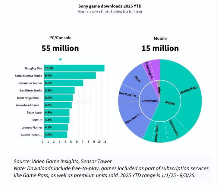 在PC/主机平台,索尼的下载量主要由内部工作室驱动:顽皮狗占比10.5%、圣莫尼卡工作室占比9.0%、失眠组占比6.8%。