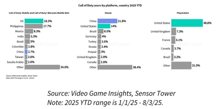 以平台划分,在《使命召唤》的手游版本(包括《使命召唤手游》和《使命召唤:战争地带手游》)和PlayStation版本的活跃用户中,美国均为第一大市场。