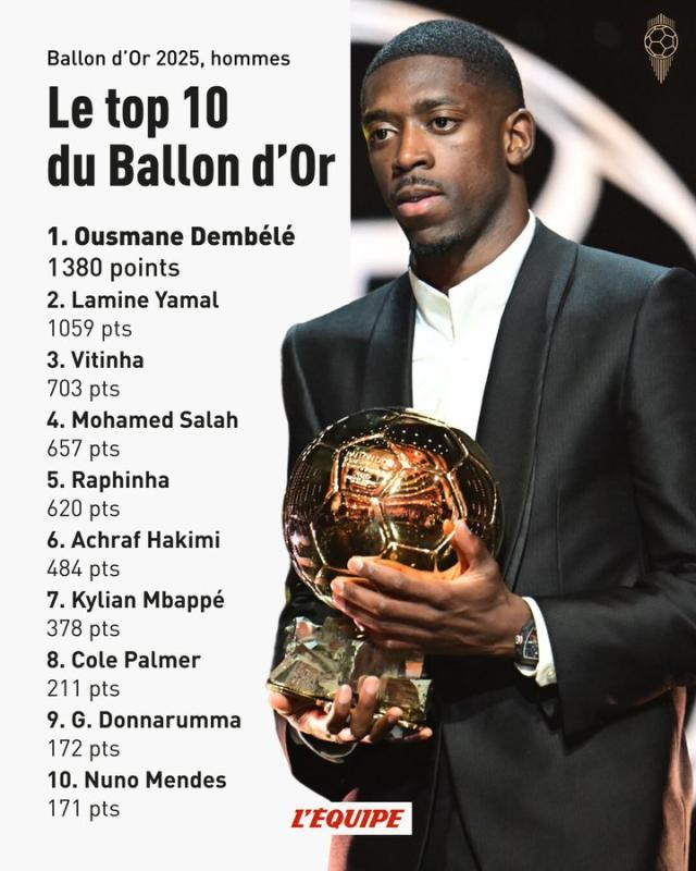 在来自国际足联排名前100国家的100位评委中,登贝莱获得了73张第一名选票,比亚马尔(仅11张)多62张。其他获得第一顺位投票的前十名球员包括:维蒂尼亚(6次)、萨拉赫(4次)、阿什拉夫(3次)、姆巴佩(1次),以及令人意外的格鲁吉亚人克瓦拉茨赫利亚和苏格兰人麦克托米奈(各1次)——两人的第一名票都是来自本国评委的“支持者投票”。