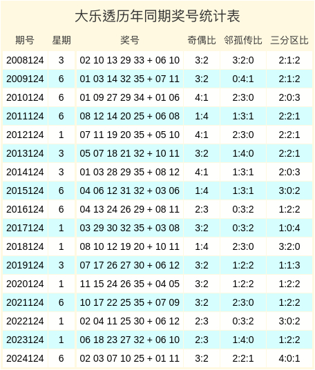 奇偶比分析:去年同期开出的奇偶比为3:2,在历年同期奖号数据中,奇偶比为45:40,本期预测奇偶比为3:2。
