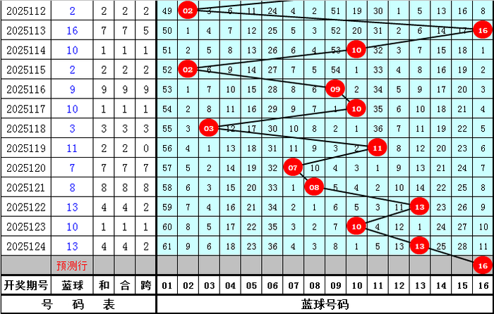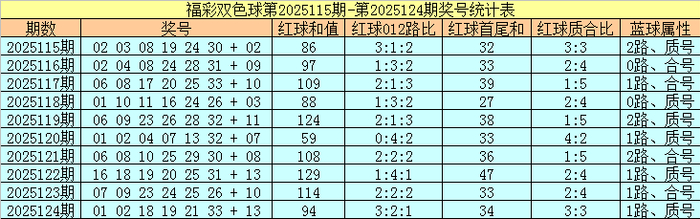福彩双色球第2025124期红球奖号为:01、02、18、19、21、33,蓝球奖号为:13,其中红球和值为94,012路比为3:2:1,首尾和为34,质合比为3:3,蓝球属性为1路、质号。