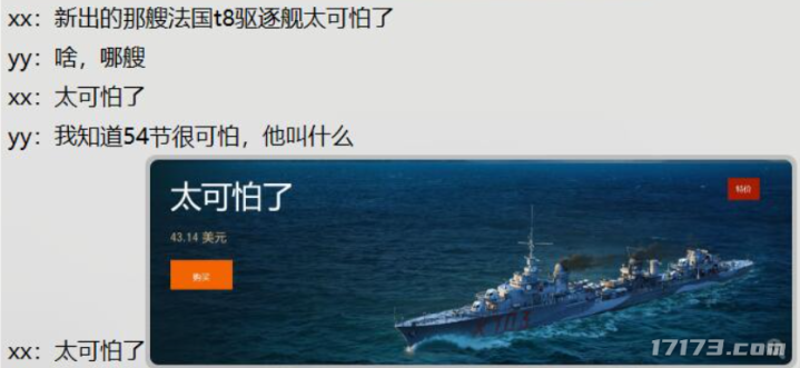 于是乎,这个离大谱的译名迅速在玩家社区走红,诞生出了大量诸如“新上线的法国驱逐舰太可怕了!它是很可怕但叫什么名字?太可怕了!”这样的谐音梗。