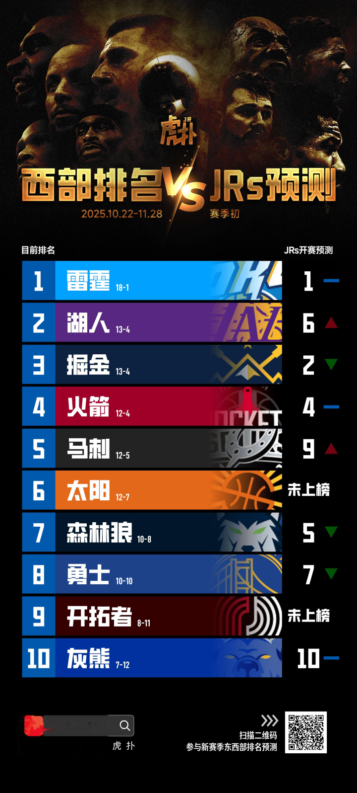 (上图为当前西部排名vsJRs赛季前预测西部排名的对比)
